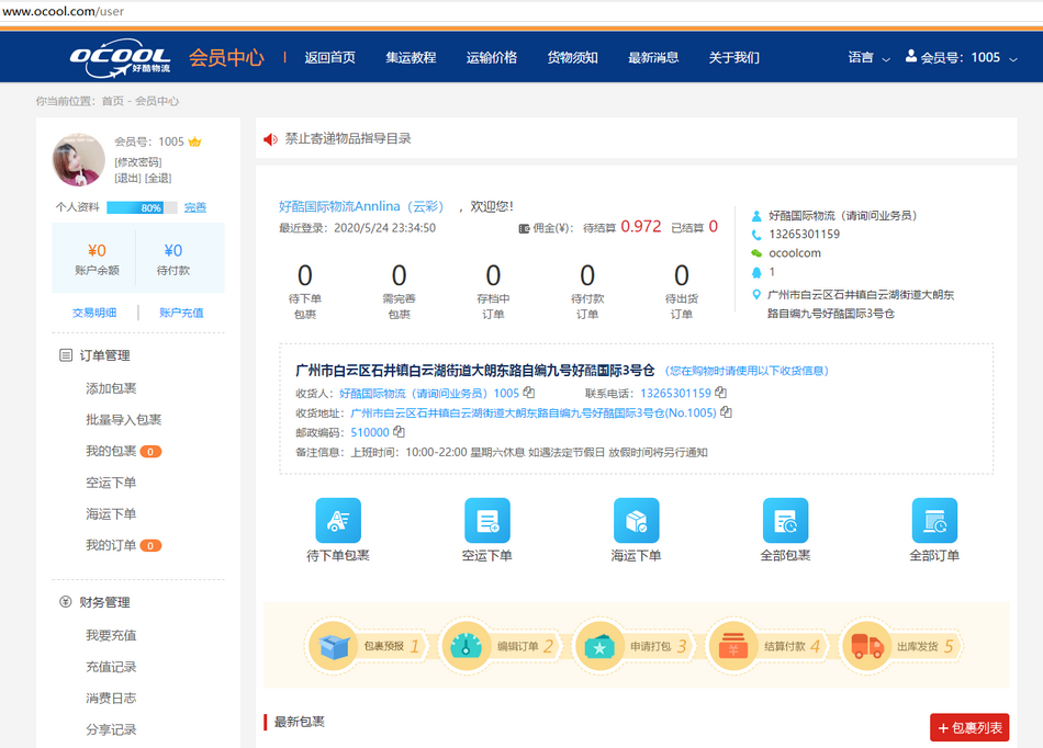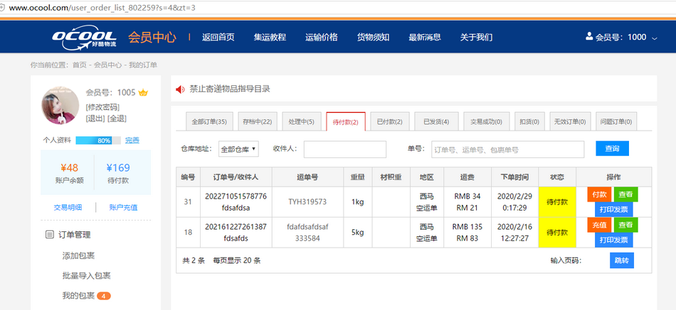 说明:点击"付款" 从会员钱包支付运费。