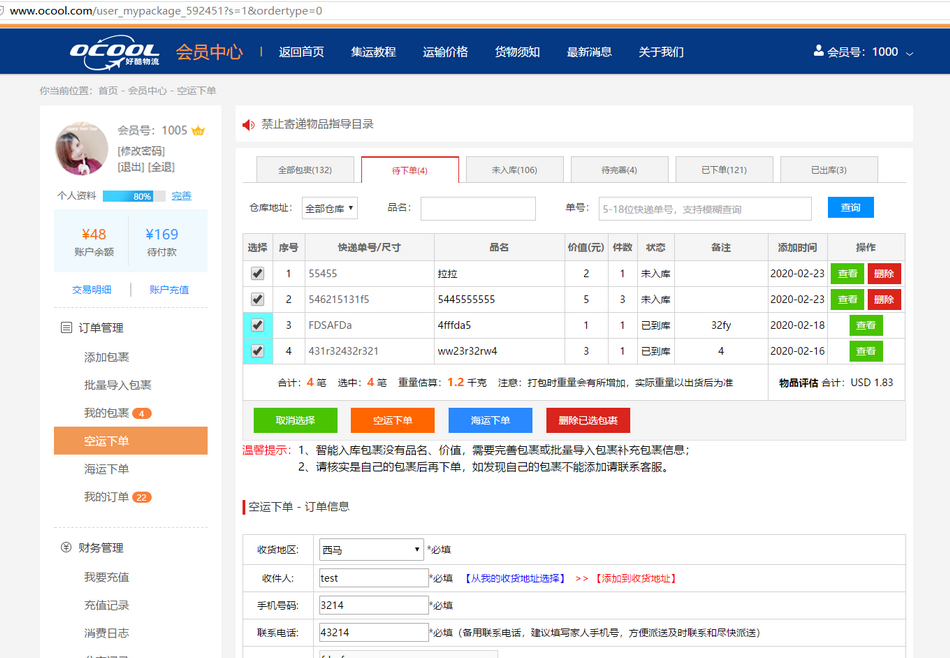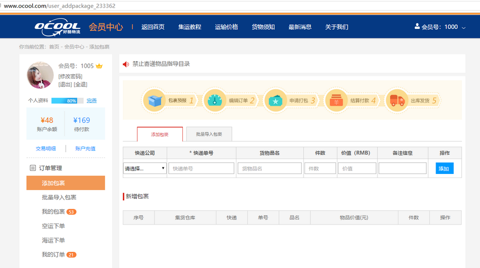 第三步:添加包裹,编辑包裹、完善包裹,支持自主预报及智能入库;